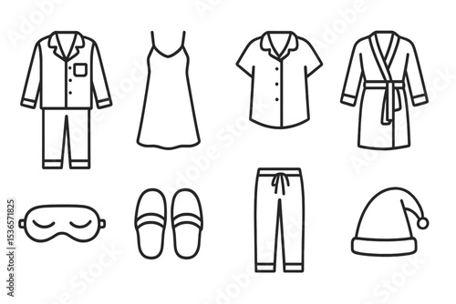 Sleepwear Icons Collection. Line style icons of sleepwear: pajamas, nightgown, sleep shirt, robe. eye mask, slippers, pajama pants