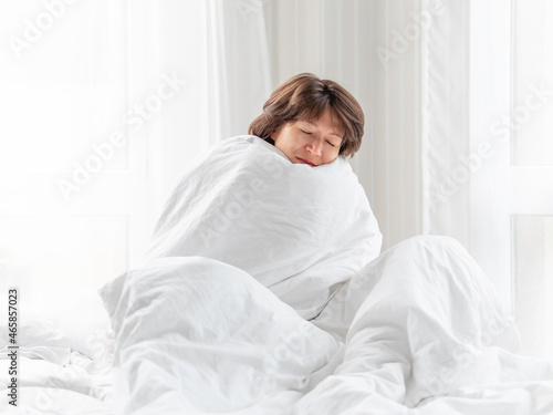 Sleepy woman is sitting in bed, completely covered with white blanket. It's hard to wake up early in morning. Woman does not get enough sleep.