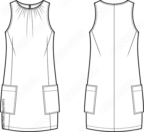 Sleeveless straight baby dress with round neckline, front pleats detail, patch pockets on sides, kids fashion template, vector garment technical sketch, flat style drawing,