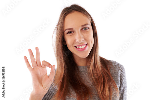female, 1, smiling, fashion, modern, casual attire, teenage, background, beautiful, clothing, posing, face, white, happiness, portrait, looking, lifestyle, cheerful, fun, brown, day, positive, emotion, hair, long, carefree, style, simplicity, isolated, attractive, caucasian, standing, sweater, grey, wearing, closeup, slim, charming, showing, straight, delicately, built, ok, studio, giving, satisfaction