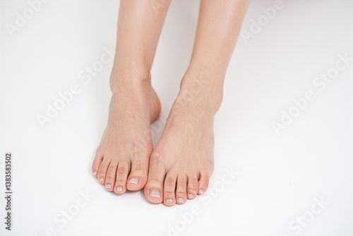 slender legs of young woman with natural neat pedicure, beautiful legs, quality pedicure, isolated on white floor,