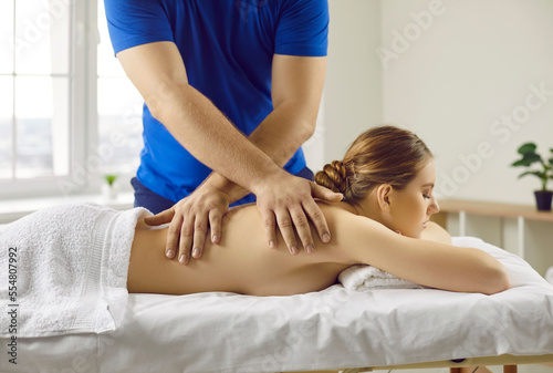 Slender shirtless woman lying on her chest receives relaxing back massage in spa or massage parlor. Side view of male masseur massaging back of woman lying on massage table. Beauty concept.