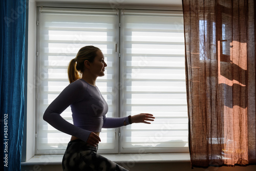 Slender young woman training at home. Beautiful female athlete working out for wellbeing during lockdown because of covid-19 pandemic. Silhouette sport girl against window. Concept of self isolation.