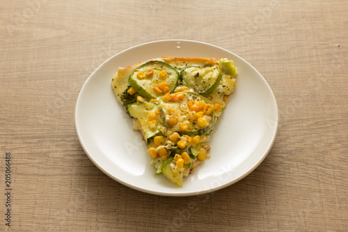 Slice of pizza: Toppings are zucchini, corn kernels and mozzarella cheese. Wooden table.