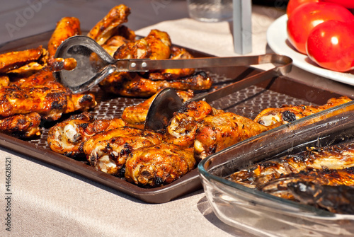 Slice pieces of meat on the grill. barbecue at the festival. Roast beef on the table.