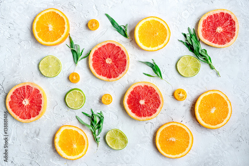 background, kitchen, table, breakfast, lunch, brunch, dinner, fresh, fruit, citrous, healthy, diet, fitness, lifestyle, vitamin, orange, lime, colourful, delicious, tasty, vegan, detox, food, sweet, sour, topview, cut, slice, tropical, bright, grey, stone, homemade, kumquat, herb, leaf