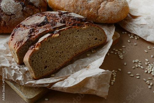 Sliced fresh bread on a wooden background. Baking bread. Natural rye bread made by hand in a home bakery from natural ingredients. Healthy food, delicious homemade bread