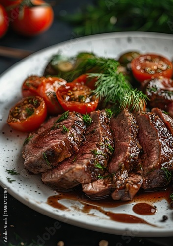 steak, beef, meat, grilled, roasted, tomatoes, cherry, brussels, sprout, vegetable, food, dinner, lunch, plate, dish, delicious, tasty, healthy, epicure, cookery, eatery, cooking, receipe, meal, protein, juicy, favor, fresh, herb, dill, dark, background, closeup, photo, image, picture, culinary, appetising, dinner, side, garnish