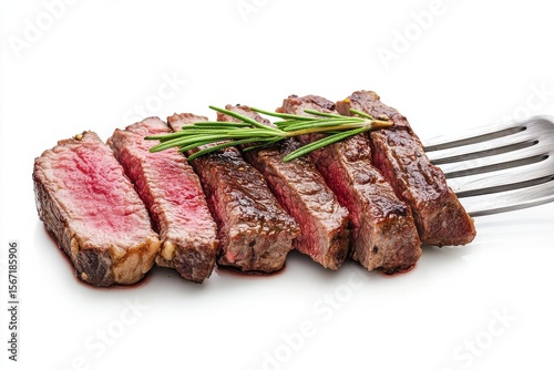 steak, grilled, sliced, beef, meat, food, delicious, eatery, dinner, cookery, epicure, rosemary, herb, fork, white, background, isolated, high, resolution, closeup, juicy, appetising, cooked, protein, red, photo, culinary, gastronomy, dish