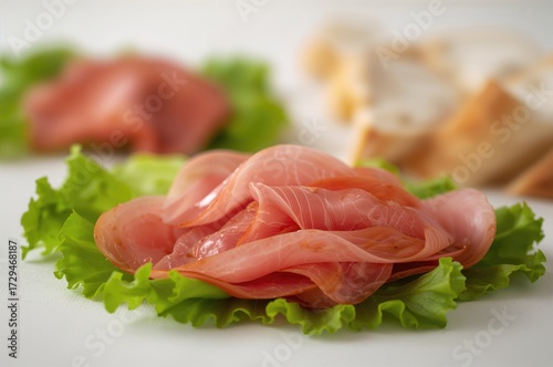 Sliced ham and fresh lettuce on plain surface