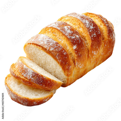 Sliced loaf artisan bread, dusted with flour on transparent background