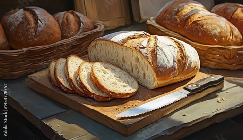 bread, sliced, loaf, wooden, board, basket, fresh, bakery, rustic, sunlight, texture, loaf, cut, knife, slice, dough, grain, gold, brown, white, light, natural, artisan, homemade, baking, flour, warm, deliciously, food, delicious, still, life, image, art, painting, digital, illustration, display, closeup, detail, healthy, alimentary, dietary, organic, craft, foodstuff