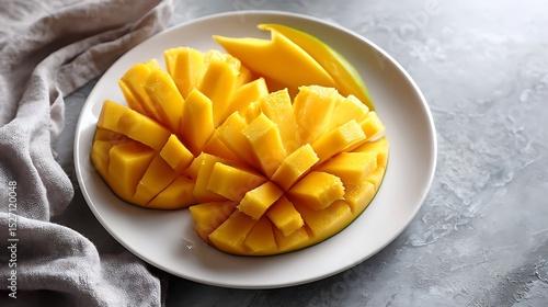 mango, sliced, fruit, white plate, yellow, fresh, food, healthy, diet, vitamin, tropical, dessert, slice, arrangement, table, clothes, background, stone, minimalist, topview