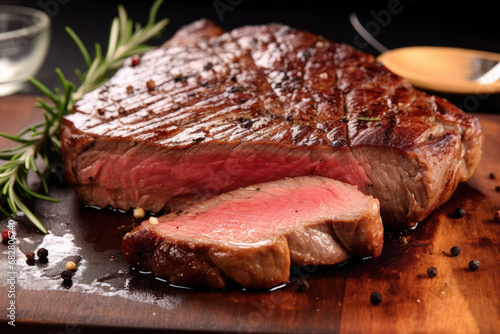 Sliced medium rare grilled Steak Ribeye with rosemary on on wooden board background