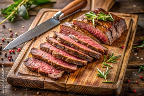 sliced, steak, wooden, cutting, board, meat, juicy, grilled, food, delicious, cooked, beef, savoury, dinner, protein, knife, fresh