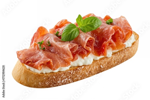 isolated, ham, prosciutto, bruschetta, toast, cheese, background, white, spanish, tapas, serrano, cooking, bread, cream, canape, food, meat, breakfast, healthy, diet, sandwich, meal, cookery, snack, epicure, eating, pork meat, smoked, baguette, slice, loaf, delicious, italian, 1, single, toasted