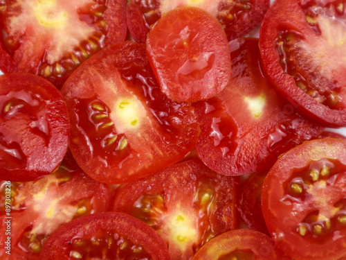 group, juicy, piece, round, shiny, single, slice, vitamin, health, ripe, salad, tomatoes, vegetable, vegetarian, cut, ingredient, raw, sliced, white, bright, chop, circle, colours, healthy, macro, object, pattern, red, tasty, background, closeup, cooking, delicious, diet, food, fresh, fruit, natural, organic, plant, top, view, tomatoes, freshness, nourishment