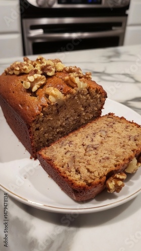 Sliced Walnut Banana Bread Loaf Close Up on White Plate Kitchen Countertop Delicious Homemade Baked Good Recipe