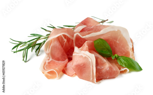 Slices of tasty prosciutto with basil and rosemary on white background