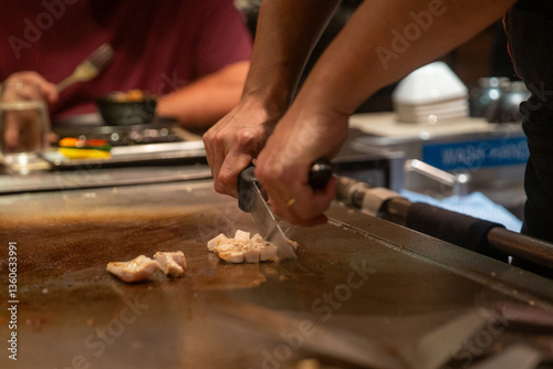 knife, slicing, japanese food, cooking, culinary, dicing, food, hand, cookery, white meat, chicken, teppanyaki, entertainment, asian cuisine, show, japanese, buttery, cruise, chicken breast