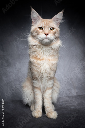 slim and skinny cream tabby maine coon kitten sitting on gray concrete style studio background