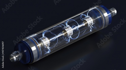 Slim motor design with highlighted end cap and trailing wires placed against smooth navy