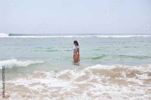 Slim young woman walks into the ocean.