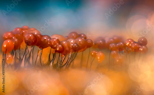 Slime molds. The smallest mushrooms in the world. Mysterious creatures of nature. Nature background.