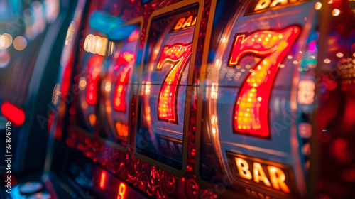 Slot machine with a winning combination of sevens in lights on a casino background. Concept: gambling, winning, entertainment. Suitable for casinos, hotels, entertainment companies. Ideal for promotin