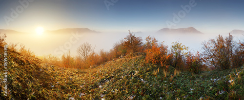 Slovakia forest autumn panorana landscape with mist in mountain, Manin