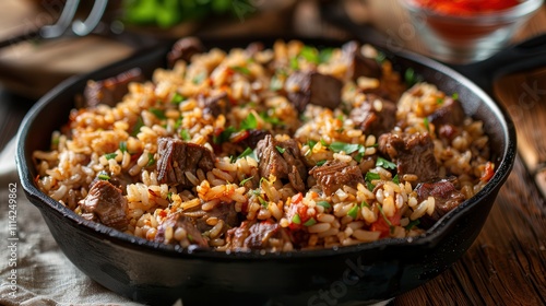 Slow cook rice for a tasty dish. Savory beef rice dish in skillet