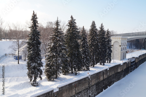 sluice, gate, urban, ice, water, moscow, shipping, grooved, winter, snow, city, river, cold, russia, bridge