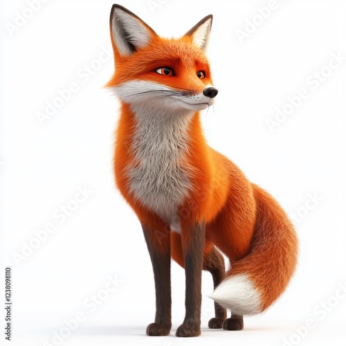 Sly red fox with bright orange fur and a fluffy tail, centered on a clean white background
