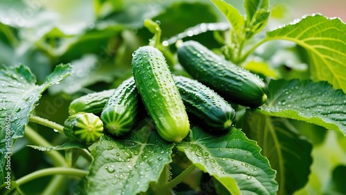 Small appetizing green cucumbers gherkins lie on green leaves, dacha, summer harvest