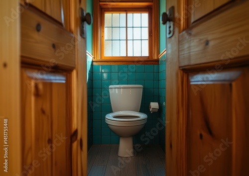 bathroom, small, teal, tiled, wooden, door, privies, white, room, interior, light, clean, rustic, cosy, private, compact, washroom, sanitary, fixture, modern, simple, elegant, functional, design, home, cabin, comfort, hygiene, privacy, neutral, wood, space, window, sunlight, cleanliness