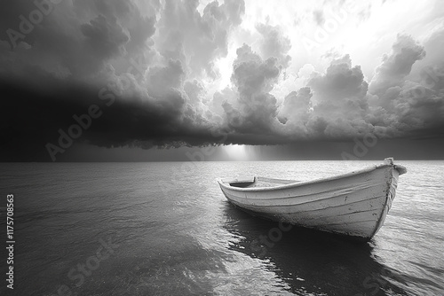 boat, small, sea, ocean, water, storm, cloud, dark, sky, weather, dramatic, moody, calm, peaceful, lonely, solitude, tranquil, serene, reflective, grey, monochrome, black, white, light, ray, hope, despair, vessel, sailing, fishing, dinghy, wooden, old, weathered, abandoned, ominous, atmosphere, horizon, ripple, surface