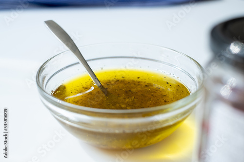 small bowl with olive oil and spices, spoon in bowl on white table, kitchen atmosphere