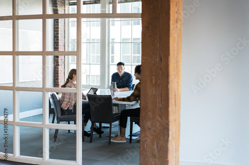 business meeting, conference room, entrepreneur, discussion, confidence, conference, computer, communication, caucasian, casual attire, businesswoman, businessman, business, bright, brainstorming, at work, black hair, window, technology, teamwork, proud, organised, office, meeting, male, leadership, laptop, horizontal, hispanic, hip, goggles, female, latino, man, person, people, adult, adult, 30s, grown-up, woman, girl, 20s