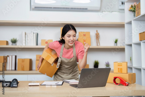 entrepreneur, celebration, home, office, package, success, woman, joy, order, fulfillment, workspace, business, startup, e-business, delivery, motivation, happiness, achievement, smile, digital, commerce, work, productivity, young, professional, creative, innovation, lifestyle, modern, technology, businesswoman, inspiration, goal, trendy, ambition, positive, smiling