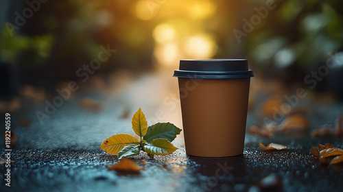 Small cardboard blank takeaway coffee cup on bench in autumn park. Fallen leaves. Close-up. Hot drink.