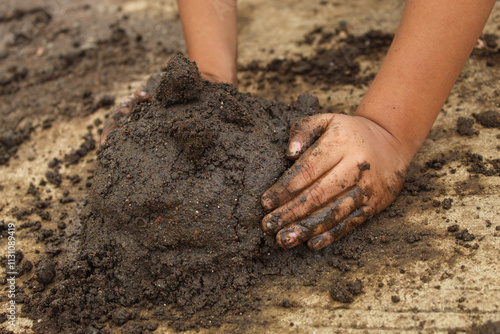 small child's hands playing with sand and mud. child playing outdoors with mud