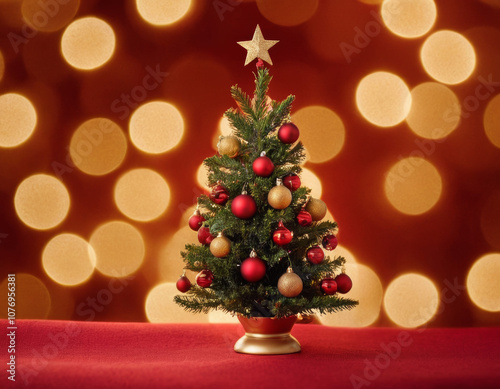 Small christmas tree decorated with red and gold ornaments standing on a red background with warm bokeh lights
