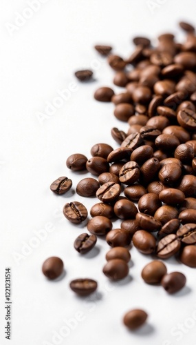 Small coffee beans scattered on a white surface, beans, grinds, coffee
