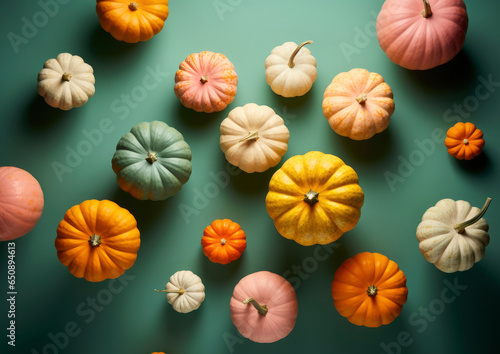 Small colorful pastel pumpkins on green background. Flat lay. Top View
