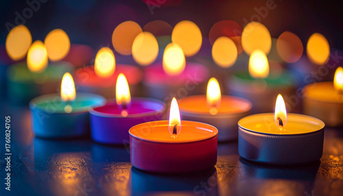 Small colorful tealight candles, wax colors, dark background, faint smoke trails, joyful Diwali