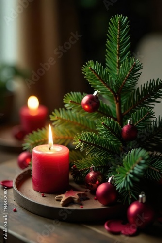 Small conifer with burning candle, simple Christmas arrangement, ample copy space , macro, winter, xmas