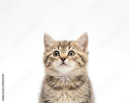 Small Cute Kitten Looking Up with Curious Eyes – Realistic Soft Fur on White Background