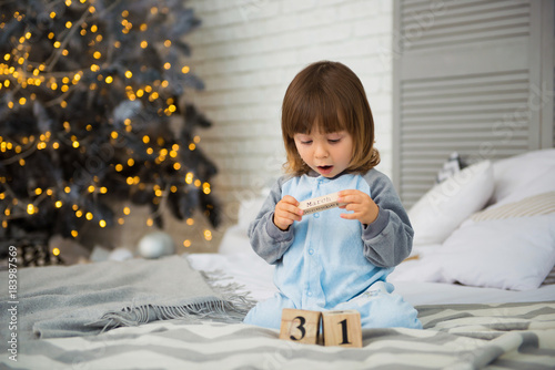 happy, new, year, 2018, christmas, christmas, holiday, winter, preparation, christmas tree, fur-tree, toy, congratulation, smiling, baby, girl, children, beautiful, small, emotional, mood, surprise, reverie, joy, delight, happiness, dream, constructed, wish, dreamer, smile, interior, room, inside, bed, calendar, 31, december, eve, garland, gift, present, grey, white, blue