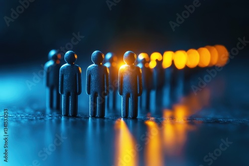 Small figurines in a row with glowing lights creating an abstract concept of connection, unity, and teamwork in a dark setting