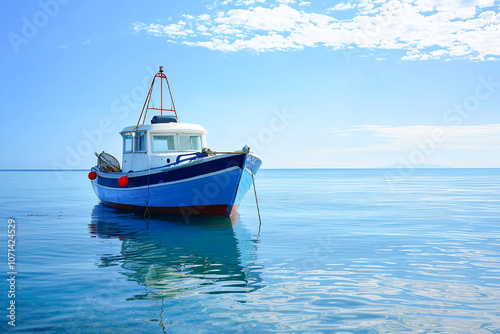boat, fishing, blue, calm, water, sea, ocean, sky, vessel, maritime, clear, peaceful, serene, nautical, horizon, summer, travel, floating, bright, calm water, summer day